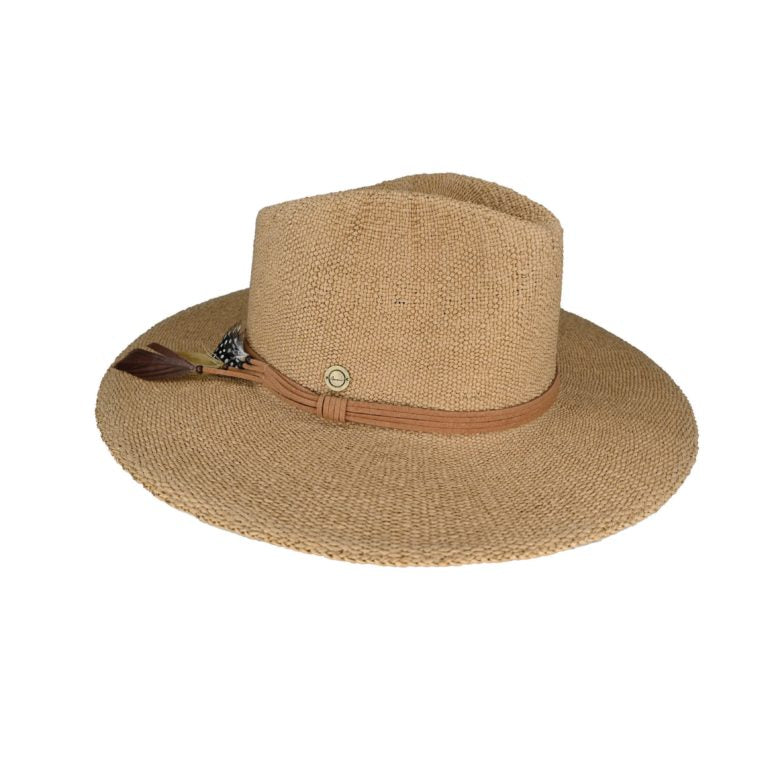 Allegra Woven Natural Fibre Wide Brim Fedora Hat with Suede and Feather Band