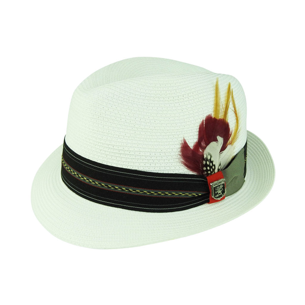 This poly braid trilby hat combines lightweight construction with structured styling, making it ideal for warm weather wear. The hat features a durable polybraid body and is accented with a grosgrain ribbon band, finished with a trio of decorative feathers for added visual interest.